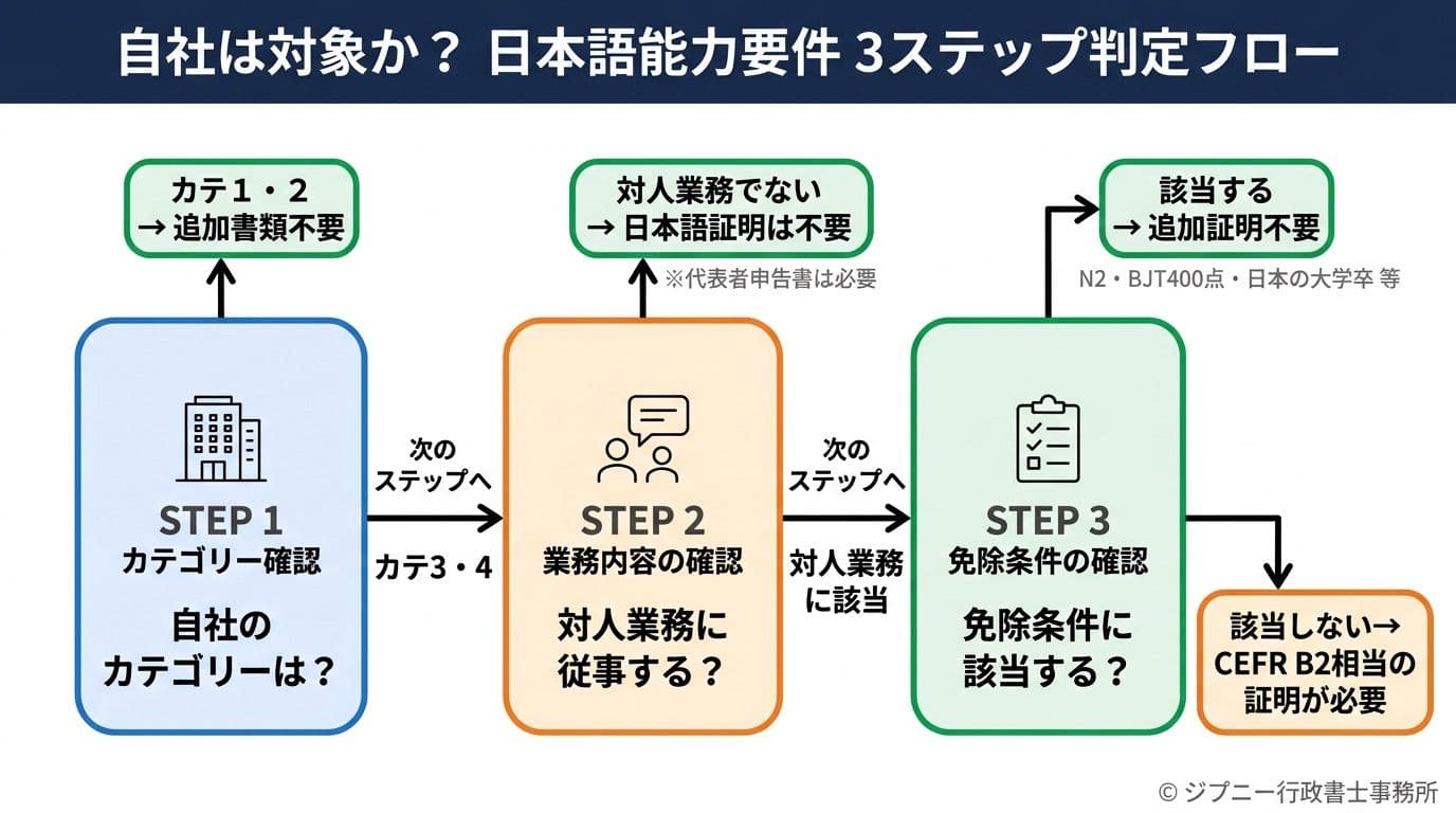 今回の追加書類と日本語能力要件は、カテゴリー3・4に適用されるものです。カテゴリー1・2の企業は、従来どおりの申請手続きで対応できます。