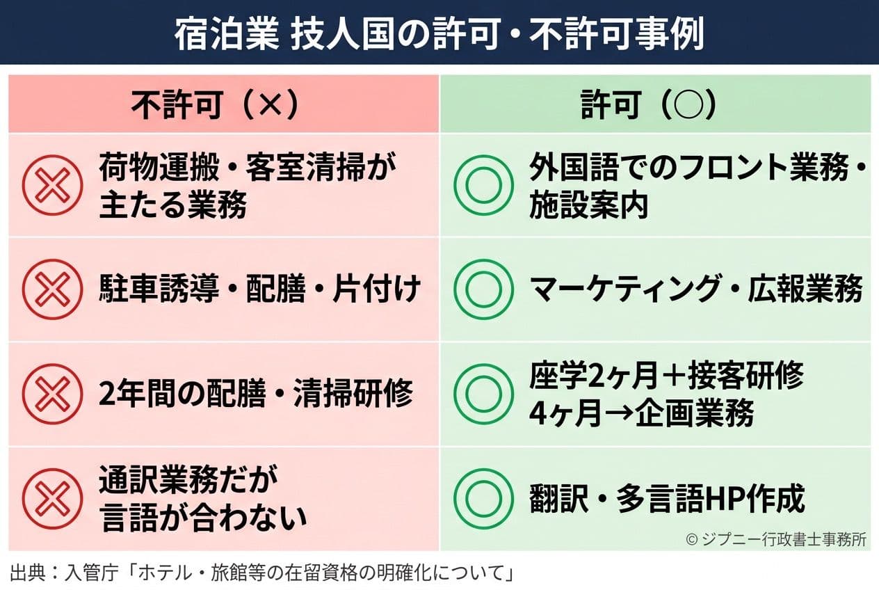宿泊業については、入管庁が「ホテル・旅館等において外国人が就労する場合の在留資格の明確化について」(別紙5、令和8年4月改訂)として具体的な判断基準と許可・不許可事例を公表しています。