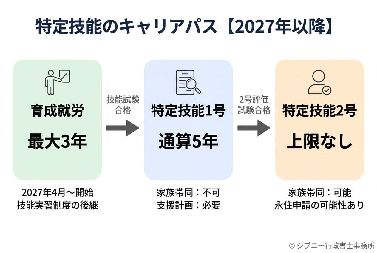 - 2027年4月から育成就労制度が開始。技能実習→特定技能の新たなキャリアパスが形成される