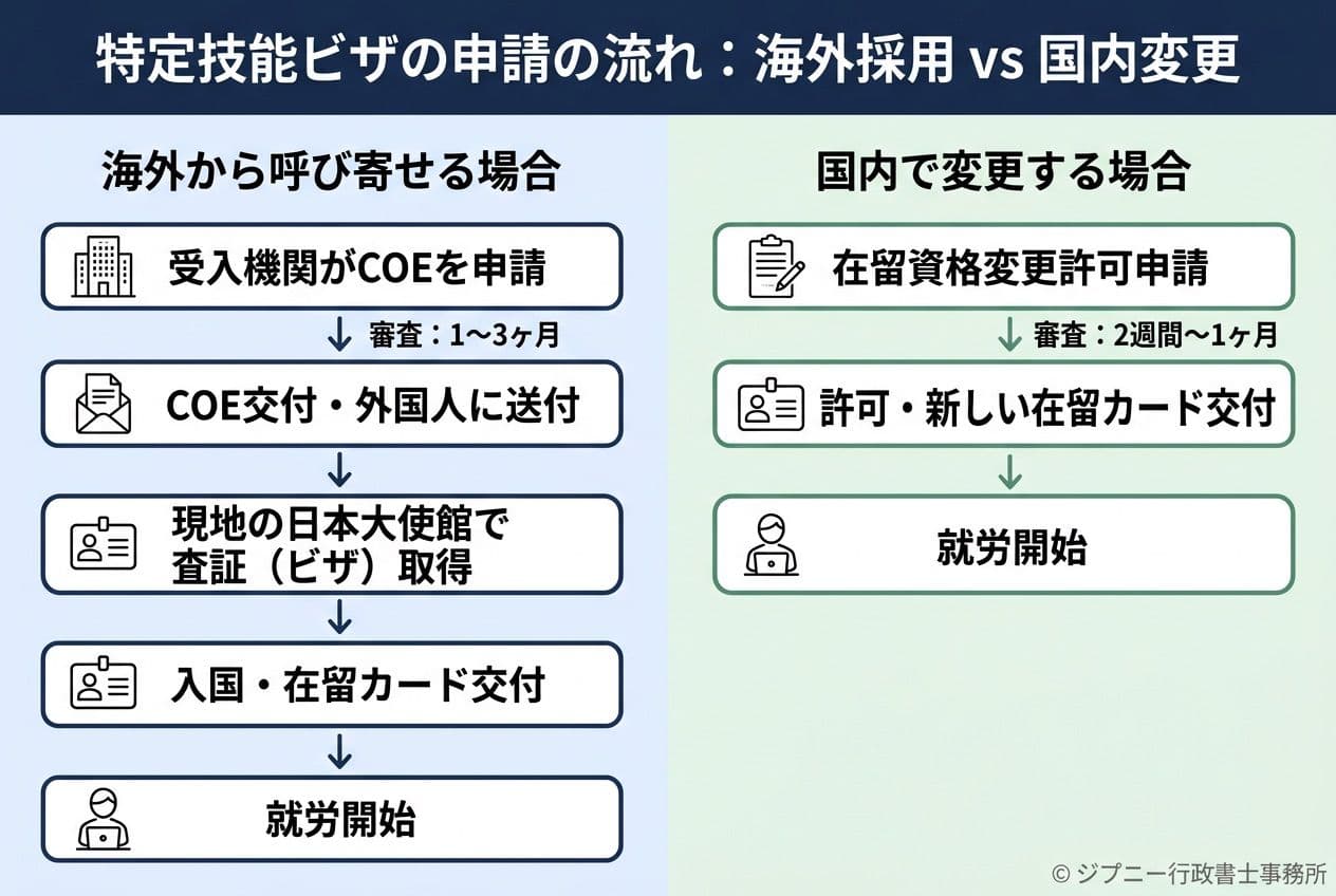 在留資格認定証明書交付申請(海外から呼び寄せる場合)は1〜3ヶ月程度、在留資格変更許可申請(国内で変更する場合)は2週間〜1ヶ月程度が目安です。1月〜3月は申請が集中するため、通常より時間がかかることがあります。