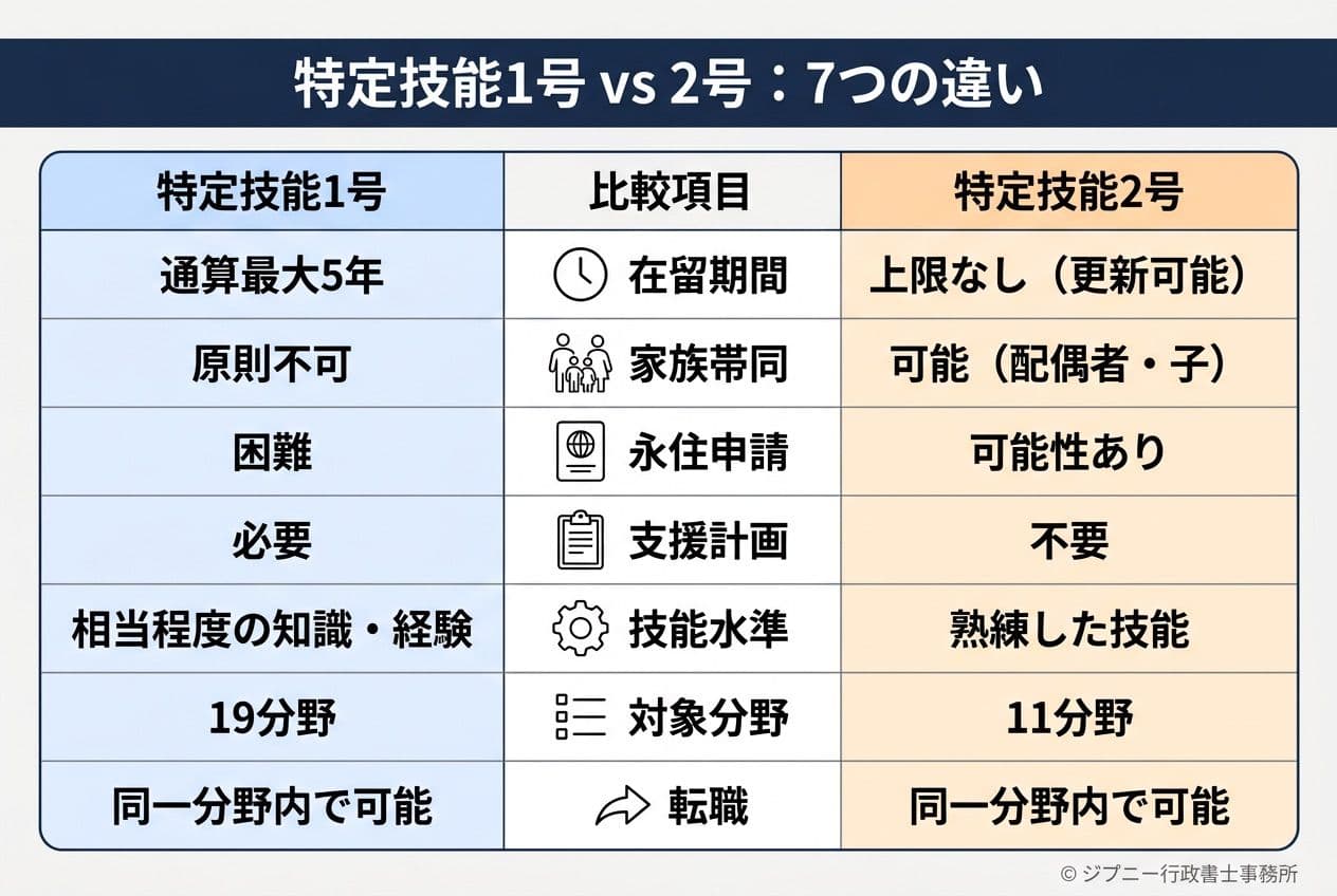 特定技能には「1号」と「2号」の2種類があります。大きな違いは在留期間の上限、家族の帯同、永住申請への道の3点です。