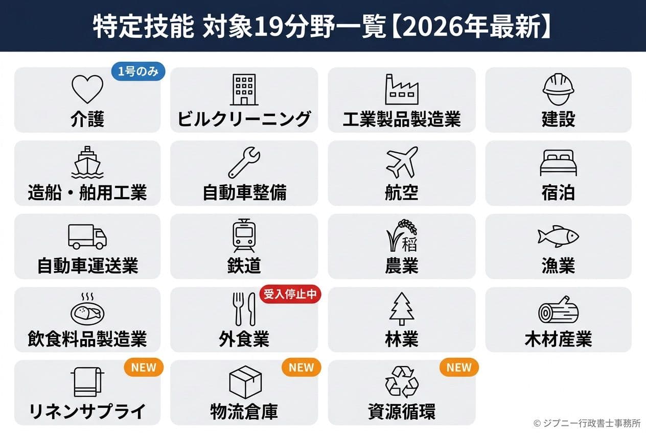 特定技能ビザは2019年に始まった比較的新しい制度で、毎年のように対象分野の追加や要件の変更が行われています。2026年1月には対象が19分野に拡大された一方で、外食業は受入停止になるなど、分野ごとに状況が大きく異なります。