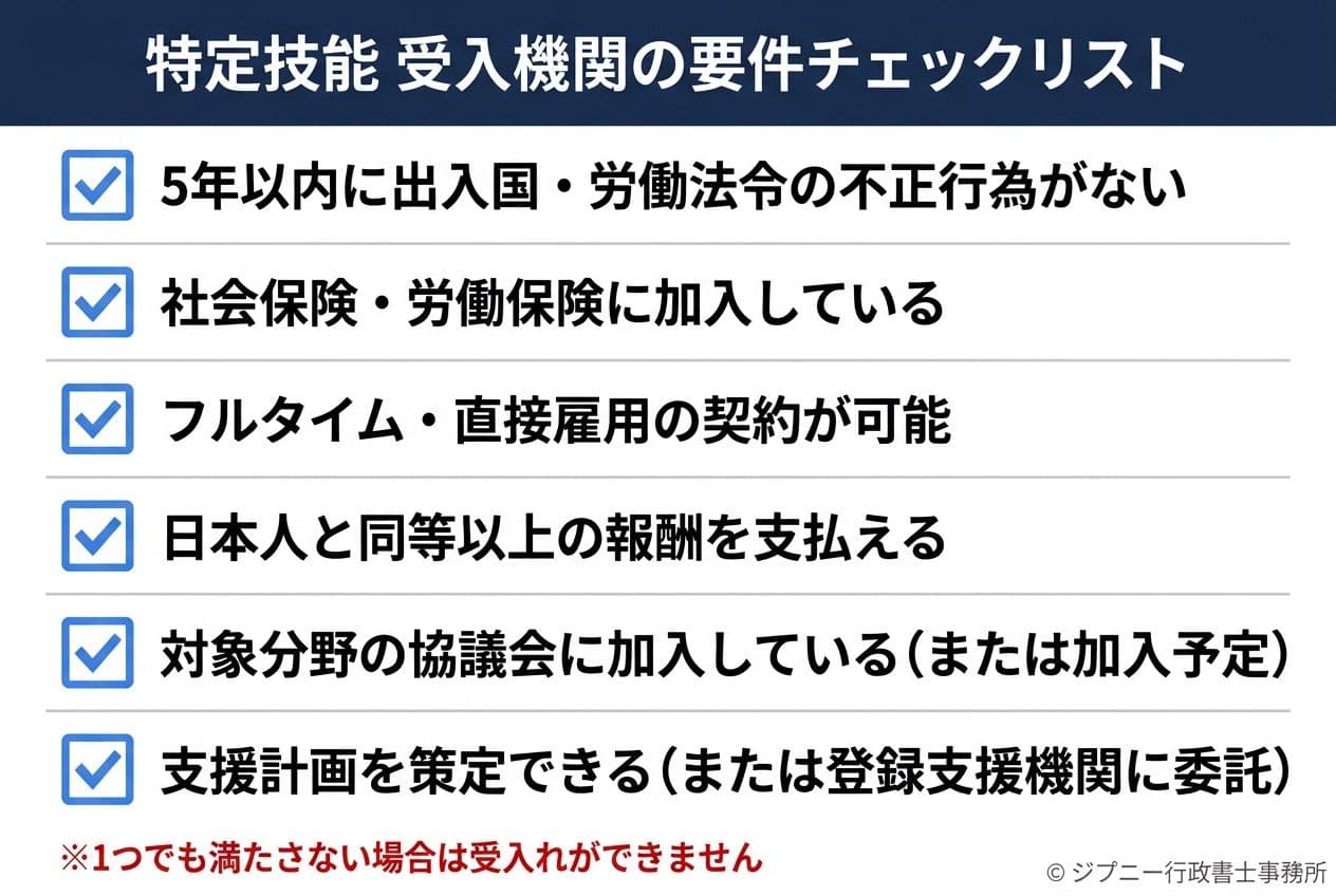 特定技能外国人を受け入れる企業(特定技能所属機関)には、以下の基準が求められます。